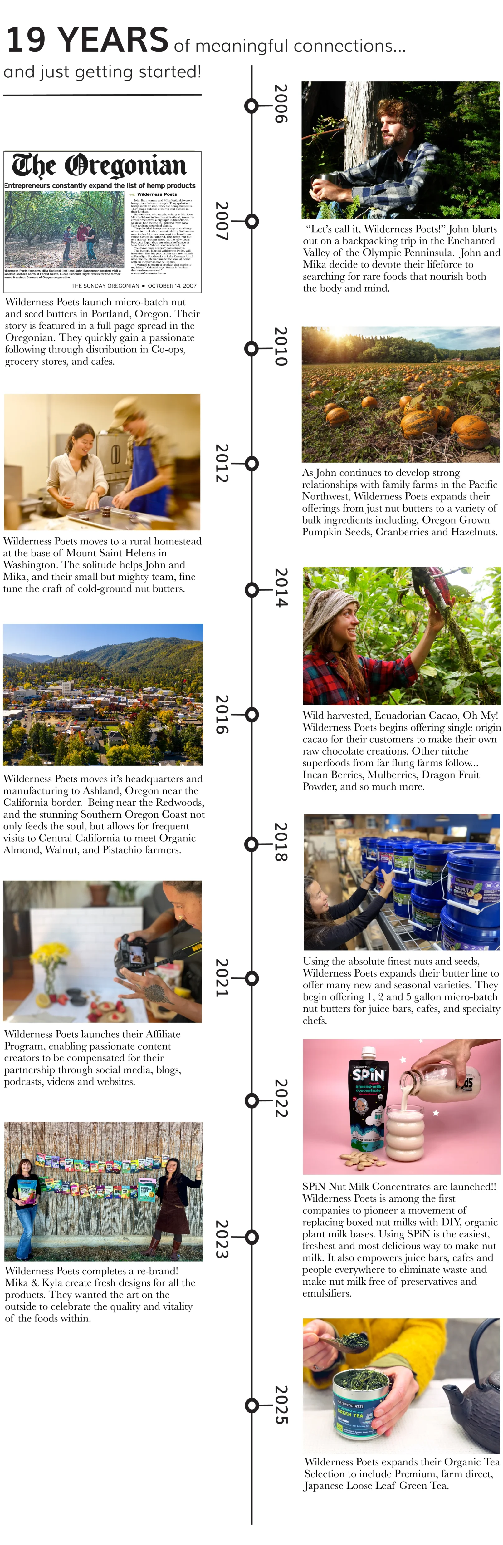 Since 2006, Wilderness Poets has been manufacturing Raw, Organic Nut Butters, Trail Mixes and Plant-Based Superfoods. Rooted in the Mountain Valley of Ashland, in Southern Oregon, we distribute our foods worldwide. Our products can be found in natural food stores throughout the United States and online at WildernessPoets.com