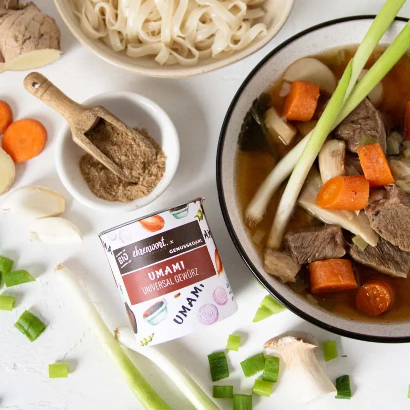 This aroma bomb has nothing to do with artificial flavor enhancers! The BIO Umami Universal spice preparation gives all dishes real depth of taste. An important ingredient is an organic seasoning powder, which is produced during the production of Wiener Würze, a regional soy sauce substitute made from organic lupins from genusskoarl. Dried tomato flakes provide further umami notes. Refined with all kinds of intense spices, the result is a very balanced mixture. Used sparingly, it spices up sauces, soups, dips, risotto and many other dishes and adds that certain something. A real all-rounder and truly natural flavor enhancer!