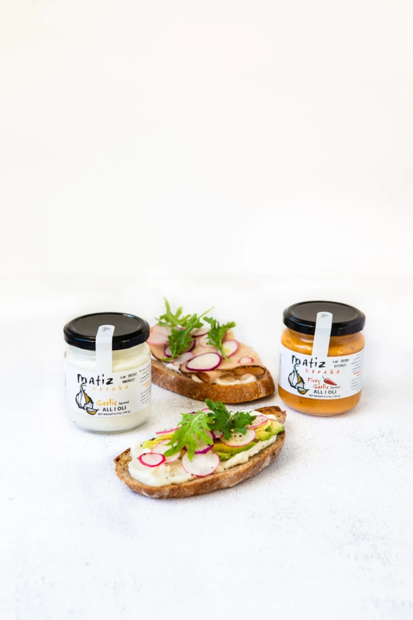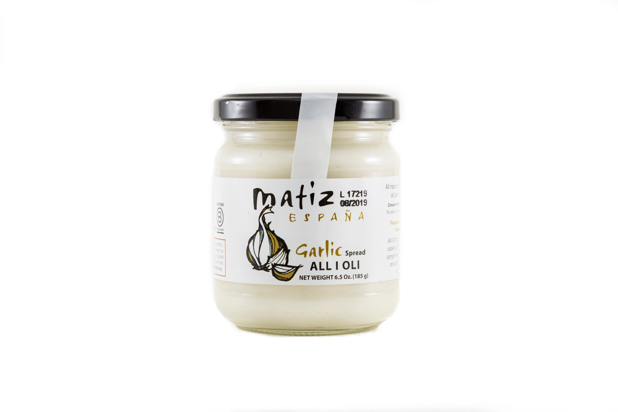 Matiz all i oli garlic spreads are a garlic lover’s dream. Simple, all natural ingredients are combined in a traditional, eggless recipe that has been used in kitchens in the catalan region of Spain for centuries. These sauces are wonderful on meat, seafood, and vegetables. Cook with it, use it as a dip, or spread it on sandwiches.