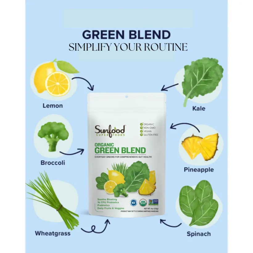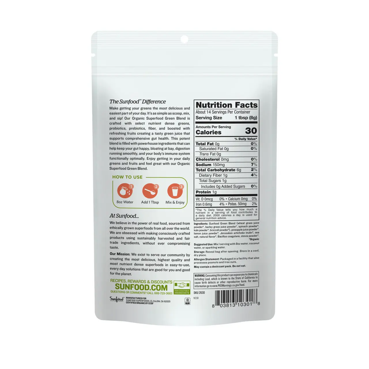 Sunfood Superfoods Organic Green Blend amazing for the entire family! Starting in our famliy kitchen, we careully chose a variety of greens and fruits, then added probiotics and prebiotics! Greens are the true MVP of nutrients, keeping the gut happy, digestion running smoothly, and the body working optimally – leaving you feeling great! Gentle enough for kids, this blend is a sure to be a family favorite! Organic Green Blend is an easy and delicious way to include greens in your daily diet. Trust us, adding this simple step in your routine is the key to a healthy and robust immune system and well-being. Increase energy, feel great, balance your gut-health with this simply nutritious Organic Green Blend.