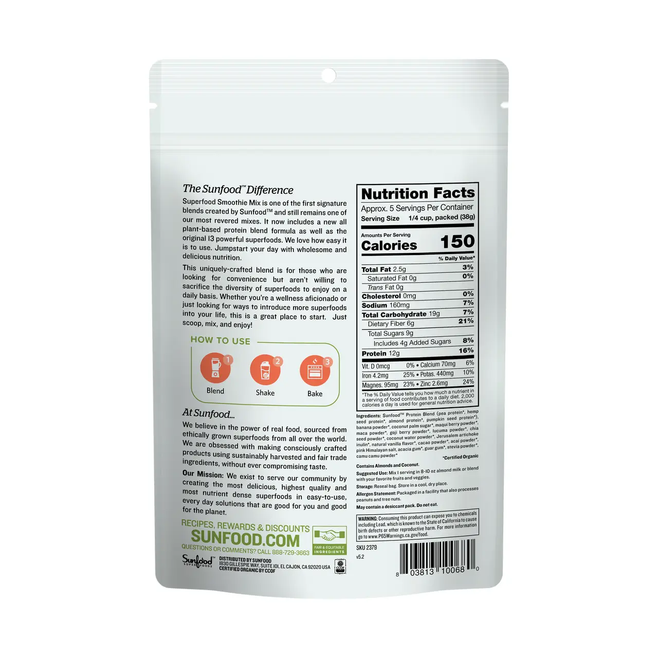Sunfood Organic Superfood Smoothie Mix is our original signature blend, designed to simplify nutrition without sacrificing quality. It brings together 13 superfoods, fruits, and plant-protein components for an all-in-one, versatile, nutrient-rich drink mix. Because so many of us struggle to get enough variety into our daily routines, this product helps cover more bases with superfruits, adaptogens, plant proteins, and fiber in one delicious, easy-to-use formula. Use it as a daily smoothie base, a quick meal boost, or to enrich bowls, shakes, or baked goods.