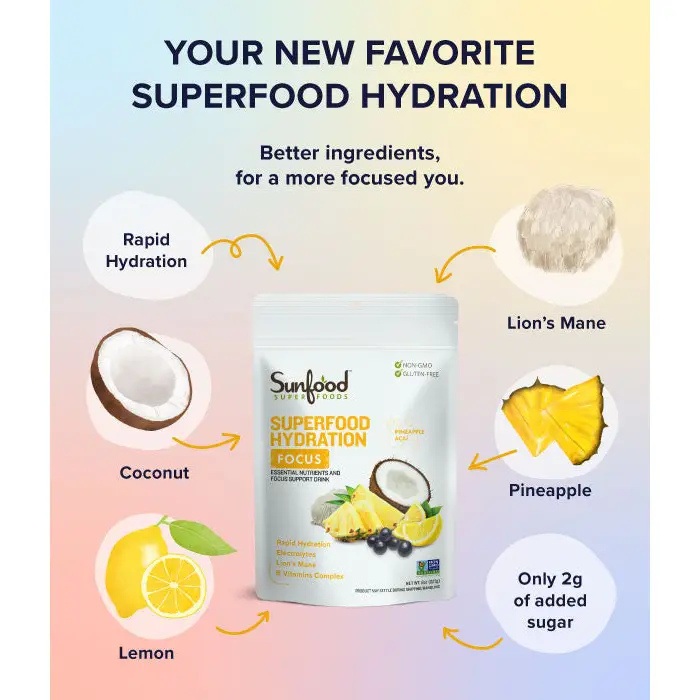Every drop counts! That’s the philosophy behind Sunfood Hydration Focus. While many hydration powders focus only on electrolytes and contain heavy sugars, this blend integrates B vitamins and real fruits to support cognitive performance under stress or exertion. The base of coconut water provides a natural source of potassium and magnesium; pink Himalayan salt delivers trace sodium and mineral balance. Lemon and pineapple add subtle sweetness, flavor, vitamins, and gentle acidity to help absorption and taste. The addition of B3 and B6 helps convert food into fuel and supports neurotransmitter balance. This blend is suited for workouts, busy workdays, or anytime you need hydration with clarity, whether before, during, or after exertion.