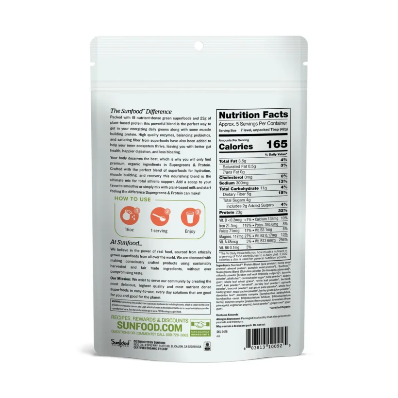 This blend brings together two nutrition powerhouses: a unique plant-protein blend and a wide spectrum of greens. Sunfood’s Organic Supergreens & Protein blend provides all nine essential amino acids, supporting lean muscle repair and daily nutrition. The supergreens composition features algae, grasses and leafy botanicals that contribute chlorophyll, phytonutrients and green vitality. Formulated to deliver serious nutrition in one scoop, this product is perfect for those who want to simplify wellness without sacrificing ingredients. Whether you’re recovering from a workout, offsetting a busy lifestyle or ensuring your greens intake is consistent, this blend has been crafted with intention. No compromises on taste or purity: only organic ingredients, no fillers, and a formula developed for real results.